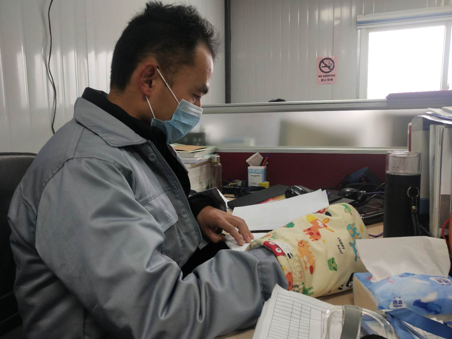 2020年2月15日,是南通飛宇電器設(shè)備有限公司復(fù)工的第二天。一大早,在辦公樓門口的消毒處,一個(gè)熟悉的身影已經(jīng)完成了手部除菌,排隊(duì)準(zhǔn)備接受額頭測溫。