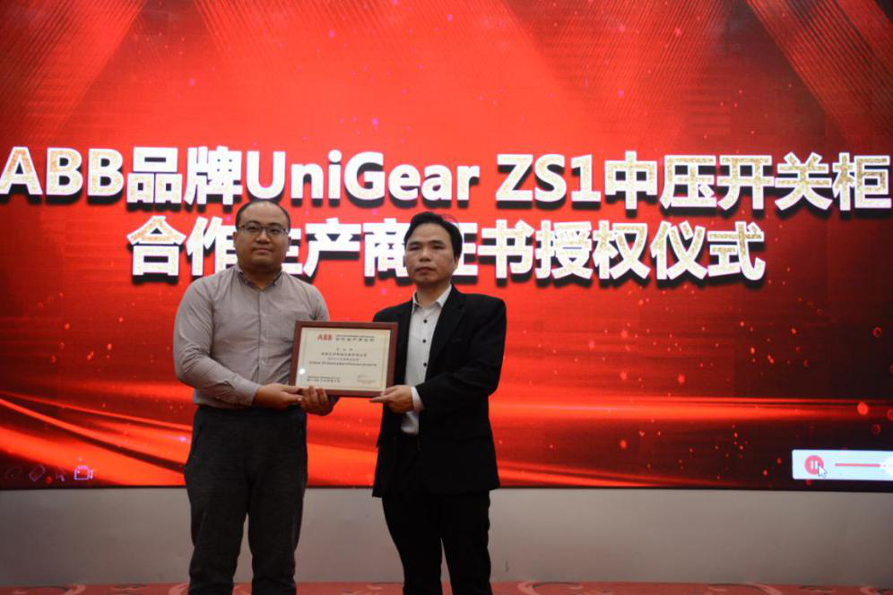 ABB作為全球領(lǐng)先的中、低壓開關(guān)柜和斷路器制造商,已連續(xù)多年躋身“中國電氣工業(yè)100強(qiáng)”和“世界500強(qiáng)企業(yè)”行列。公司市場部經(jīng)理蘇銀鐘作為南通飛宇電器設(shè)備有限公司的代表,接受了ABB品牌UniGear ZS1中壓開關(guān)柜合作生產(chǎn)商證書牌匾的授予。