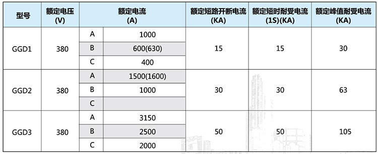 GGD型低壓成套開關設備按用途可分為受電柜、母線聯(lián)絡柜、饋電柜、電動機控制柜、無功功率^嘗柜和照明配電柜等。該結構具有分斷能力高、動熱穩(wěn)定性好、設計靈活、組合方便、系列性實用性強、結構新穎、防護等級高等特點。